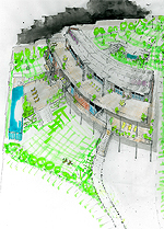 This house’s depth is an Atrium deep inside in the earth, in the centre of this perspective, where life is focused and centralized to the point! Here it will be nice in hot days for a good hide away in a tropical garden with pond, listening to the water fall. From this “point of view”, the house opens wide towards the northern hemisphere sun and Johannesburg views.